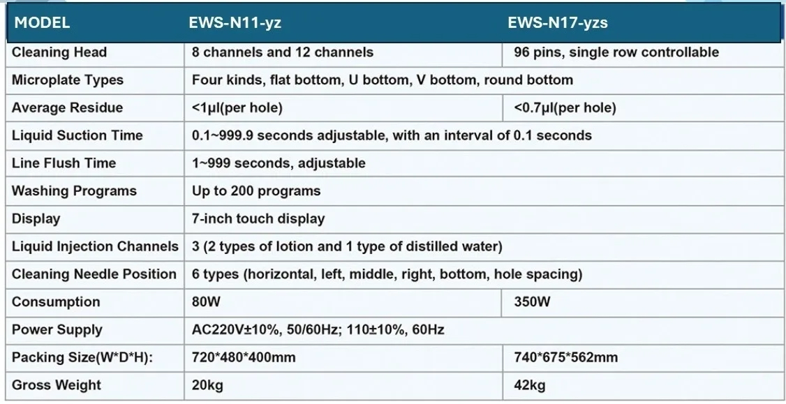 Two independent models of microplate washers, EWS-N11-yz and EWS-N17-yzs, each equipped with a 16-channel (32-pin) washer head, designed for precise multi-well cleaning.