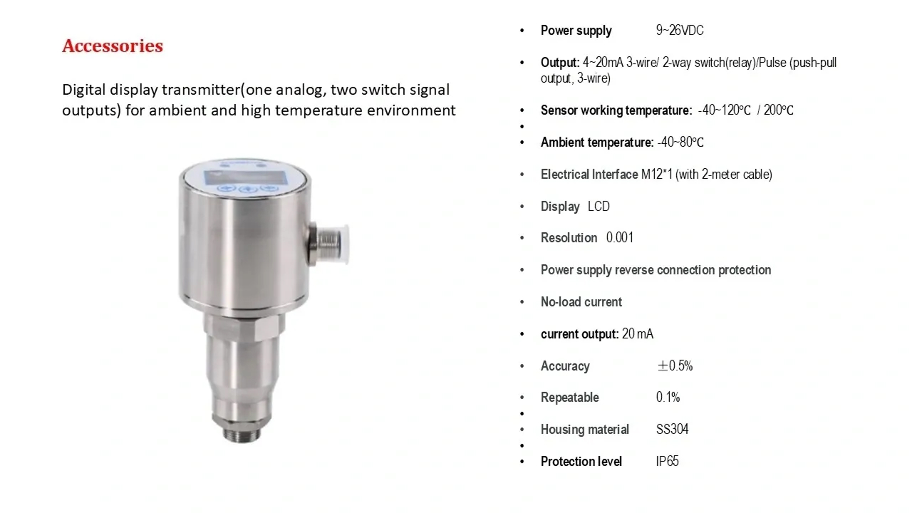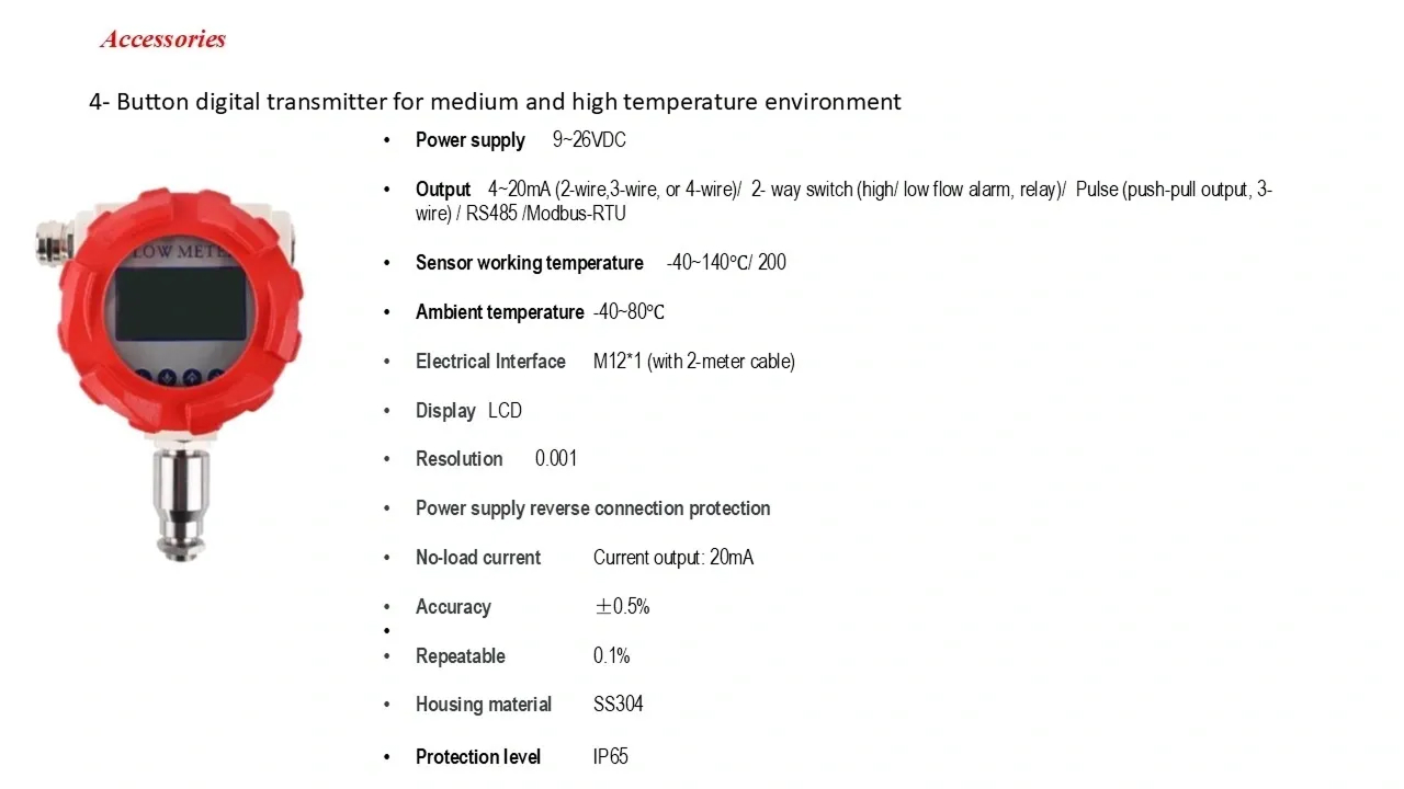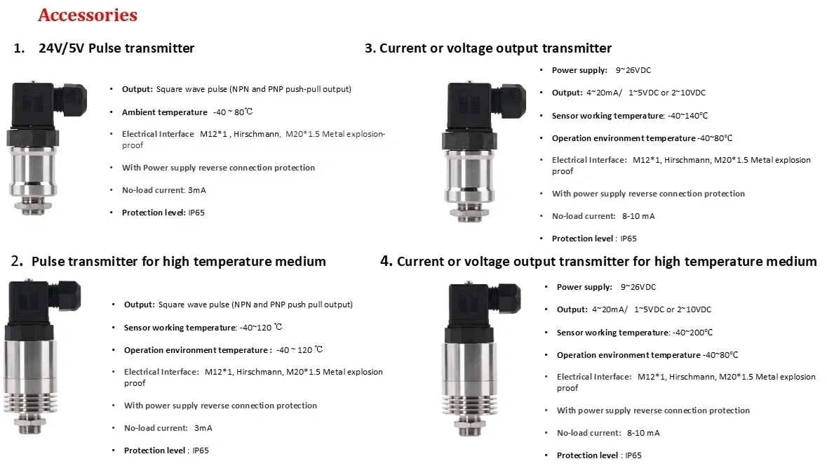 • Output signal: Analog (4–20mA, 1–5V, or 2–10V), Pulse frequency 5Khz (Max)