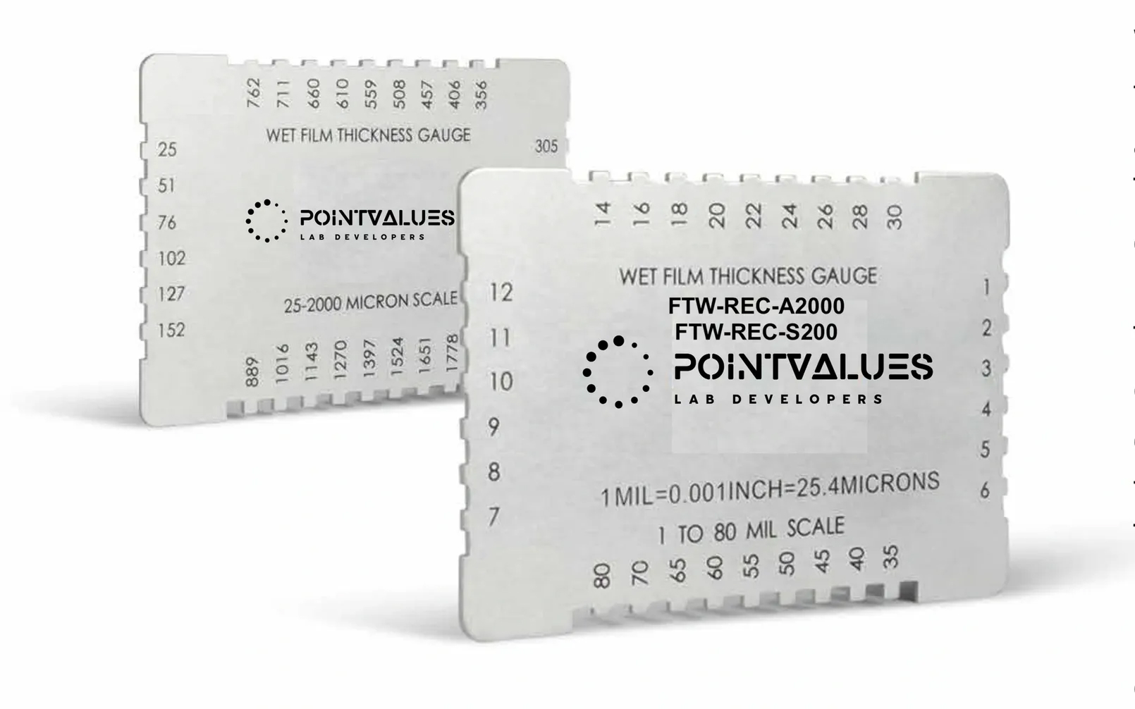 The POINTVALUES Wet Film Thickness Gauges are precision comb-shaped tools designed to approximate the thickness of liquid coatings on wet surfaces. Available in hexagonal, rectangular, and circular shapes, they come in aluminum or stainless steel options for durability and corrosion resistance. With measurement ranges from 10–2000 μm (or 1–80 mil), they offer quick and reliable thickness readings. Each gauge can be certified with dual or single scale tolerance certificates in mils and/or microns, ideal for quality control in coating applications.